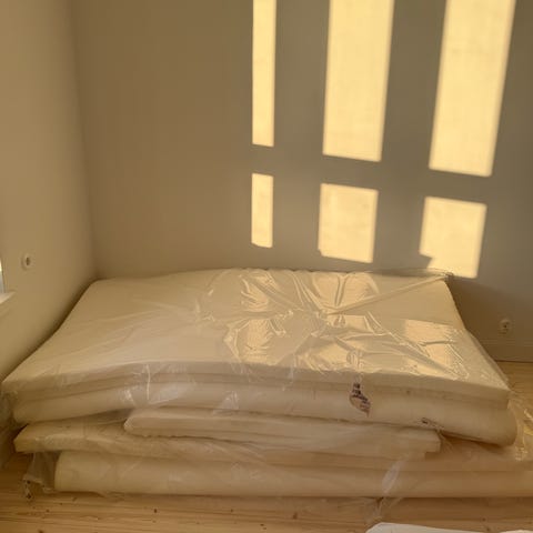 Käytössä hiukan nuhraantunut, mutta ehjä vaahtomuovilevy. Koko L94cm K174cm P10cm.