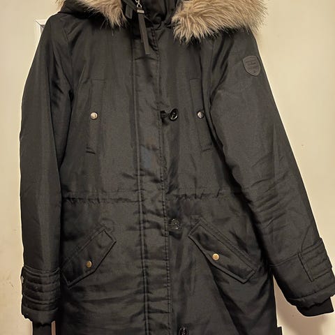 Vero Moda naisten talvitakki koossa M, väriltään musta. Takissa on edessä napitus sekä vetoketju. Hupussa on tekoturkisreunus. Takissa on etutaskut ja säädettävä vyötärönyöri.