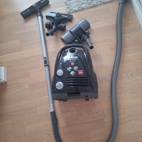 Hoover Telios Extra -pölynimuri. Sininen vetomallinen pölynimuri.jossa teleskooppiputki ja joustava imuletku. Mukana useita suulakkeita.