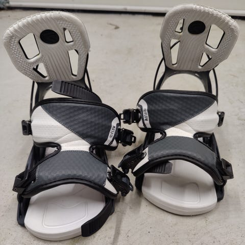 Naisten Ride VXN lumilaudan siteet. Väri valkoinen, rispaantuneet sträpit, koko muistaakseni m