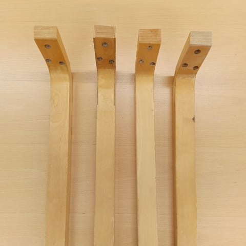 Artek 69 tuolin etujalkoja 4kpl. Jonkin verran matkan varrella tullut kolhuja ja käytön jälkiä sekä kulumaa. Joissain etujaloissa on aavistus ajan tuomaa kuivumista. Yhden etujalan alaosassa pientä pintahalkeamaa, ei näyttäisi olevan läpihalki (tämäkin näkyy kuvissa), mutta muuten hyvä kuntoisia.