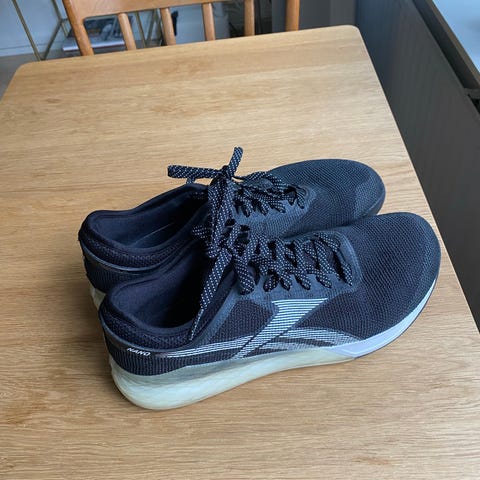 Reebok Crossfit Nano 7.0 treenikengät salitreeniin. Kengät ovat naisten mallia, merkitty koko 40. Vaataa mielestäni koko 39. Väri vihreän ja mustan sävyinen. Vahvistettu rakenne tukee jalkaa sivuttaisliikkeissä. Pohja on tasainen ja pitävä, suunniteltu erityisesti voimaharjoitteluun ja salitreeniin.