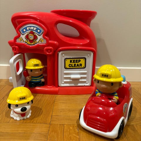 Pieni paloasema, liikennemerkit ja valonheitin, jonka kallistuskulmaa saa muutettua. Keltainen ovi aukeaa ylöspäin. Katolla paikka helikopterille. Liukumäet irrotettavat helpompaan säilytykseen. Pahvisessa taustakuvassa naarmuja ja kulumaa, näistä tarkempi kuva. Tarrat laitettu itse, osa vähän vinossa. Asema sopii korkeintaan noin 5cm leveille autoille.