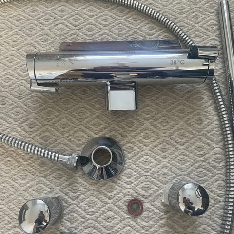 Kromattu termostaattihana kääntyvällä juoksuputkella (nyt irti ja tulpattu). Sopii hyvin myös ammeeseen.