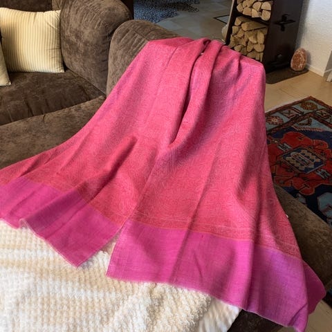 Virkattu pehmeä hartiahuivi/shaali kukkakoristeilla.