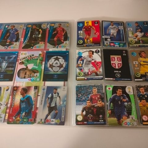Jalkapallokortteja ja kansioita. Pakettiin kuuluu useita Panini FIFA 365 ja muiden sarjojen jalkapallokortteja sekä muovitaskuilla varustettuja keräilykansioita (viisi isoa ja yksi pieni) korttien säilytykseen. Sopii jalkapallokorttien keräilyyn ja järjestämiseen.