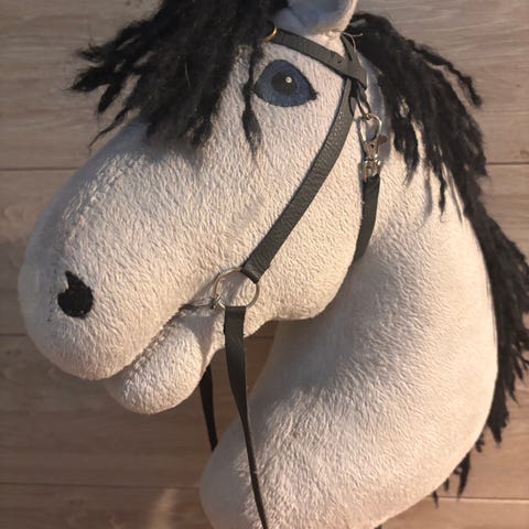 Harmaa keppihevonen. Sopii leikkeihin ja keppihevosharrastukseen eri-ikäisille lapsille.