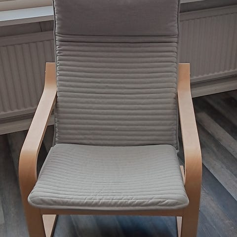 IKEA nojatuoli punaruskealla keinonahkaverhoilulla. Pyöristetty selkänoja ja käsinojat muodostavat yhtenäisen kaaren, joka antaa tuolille kompaktin ja tukevan muodon. Istuinosassa on irrotettava istuintyyny ja mukana on pieni erillinen selkätyyny. Tuolin jalat ovat vaaleaa puuta. Sopii olohuoneeseen, työhuoneeseen tai lisäistuimeksi makuuhuoneeseen.