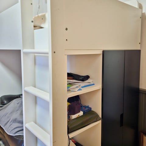 Noin 7v käytössä ollut parvisänky sinisin ovin. Käytön jälkiä on, niistä osa kuvissa. Patjan saa mukaan, mikäli haluaa.