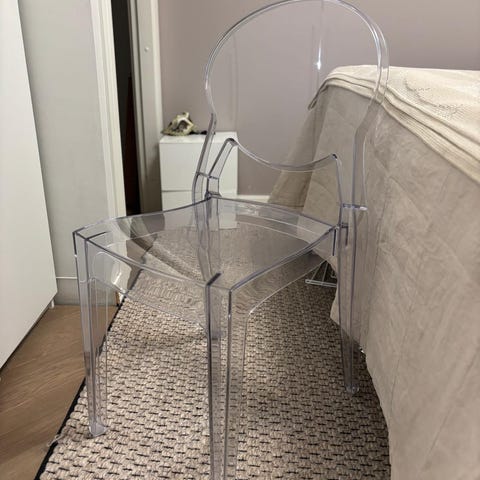 Myydään läpinäkyvä akryylinen Ghost-tyylinen design-tuoli.