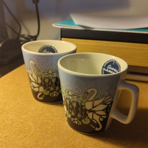 Kultakeramiikka Suomi 100 v muki joutsenkuvio valkoinen
