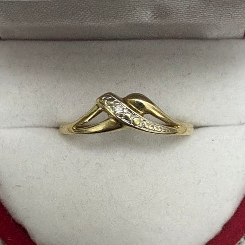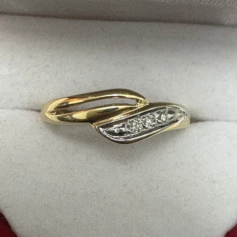 Timanttisormus 3 x timanttia, 585, halkaisija 15,7, paino 1,3 g, kaiverrettu. Ei sertifikaattia.