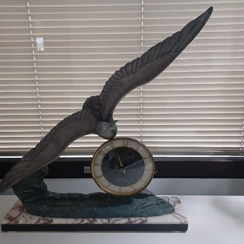 Myydään hyväkuntoinen Junghans electronic West Germany pöytäkello, jossa hopeanvärinen harjattu metallipinta ja koristeellinen kellotaulu roomalaisilla numeroilla.