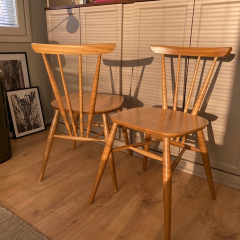 Ehjät ja kestävät pinnatuolit. Maalipinnassa kulumaa.