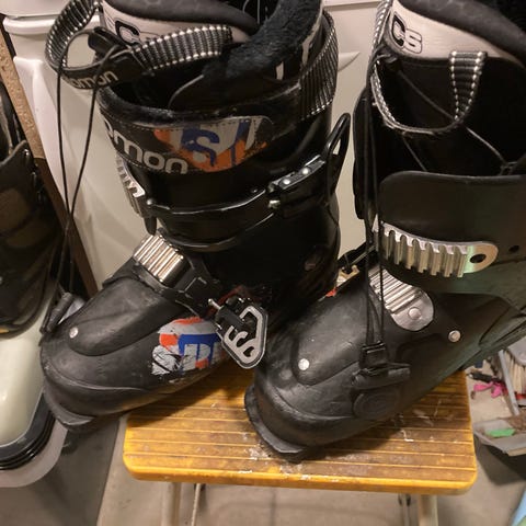 Paljon jo käytetyt, mutta toimivat Salomon My Custom Comfort Slick laskettelumonot. Väri vaalea/valkoinen, sisäosa musta. Monossa on neljä säädettävää solkea ja power strap -remmi varren yläosassa. Sisäkenkä on pehmustettu. Koko 24. Ollut käytössä noin kenkäkoon 38-39 jalassa.