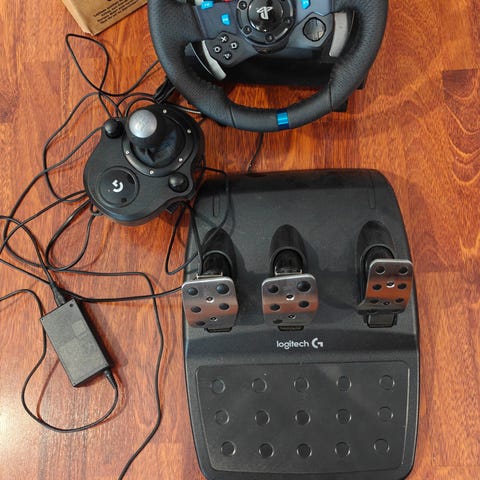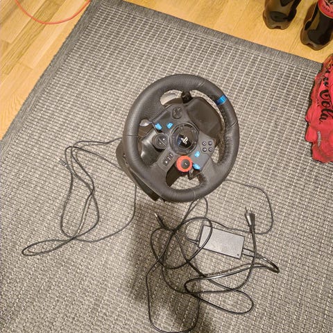 Logitech G29 Driving Force -rattiohjainsetti, johon kuuluu ohjainratti, poljinsetti (kaasu, jarru ja kytkin) sekä erillinen vaihdekeppi. Yhteensopiva PlayStation-konsolien kanssa ja pc.