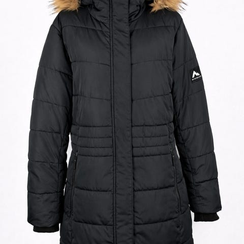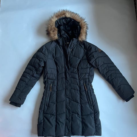 McKinleyn toppatakki kokoa D42. Hupussa irrotettava karvareunus. Väri musta/tummanharmaa.