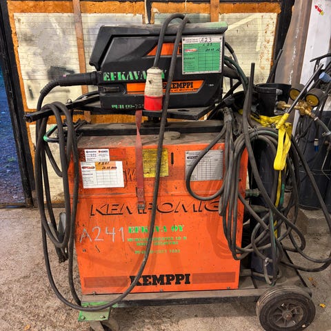 Kemppi hitsauskone. Mukana kuljetusvaunu, letkut ja poltin sekä erillinen seoskaasupullo paineensäätimineen ja painemittareineen. Laitteen tyyppikilpi ja tekniset arvot näkyvät kuvissa. Soveltuu metallin hitsaukseen.