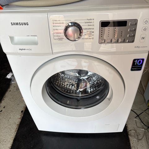 Korjattavaksi tai varaosiksi. Samsung edestä täytettävä pesukone, väri valkoinen. Pesukoneessa on etuluukku ja digitaalinen ohjauspaneeli ohjelmanvalitsimella. Sopii kodin pyykinpesuun, sijoitettavaksi kylpyhuoneeseen tai kodinhoitohuoneeseen. Tarkemmat tekniset tiedot, kuten kapasiteetti ja mitat, eivät käy ilmi kuvista.