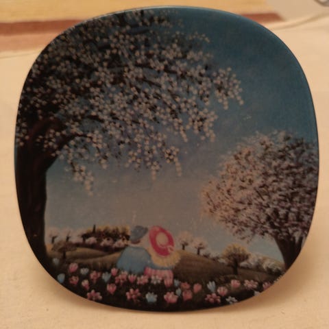 Arabia koristevati, jossa maisemakuvio syksyiseen tai myöhäissyksyiseen maisemaan viittaavalla kuvituksella. Vati on muodoltaan pyöristetty neliö ja se soveltuu esimerkiksi tarjoiluun tai koriste-esineeksi sisustukseen. Materiaalina on lasitettu keramiikka tai posliini, ja pinnalla on monivärinen painokuvio puista, pellosta ja kävelevästä hahmosta.