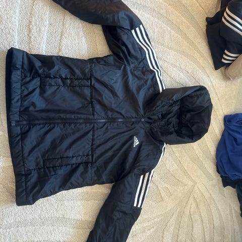 Muuten hyvä, mutta hihassa pieniä reikiä muutama. Näkyy kuvassa. Lappu leikattu pois. Noin 170cm/s nuorelle.
