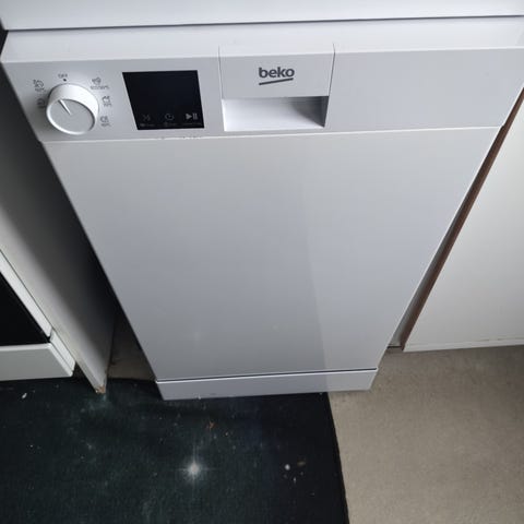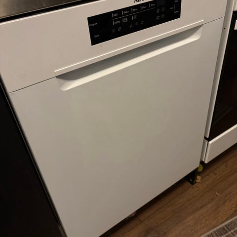Hyvin toimiva astianpesukone. Toinen etujaloista rikki, kuvassa näkyvät puupalikat toiminut mainiosti korvaajana.