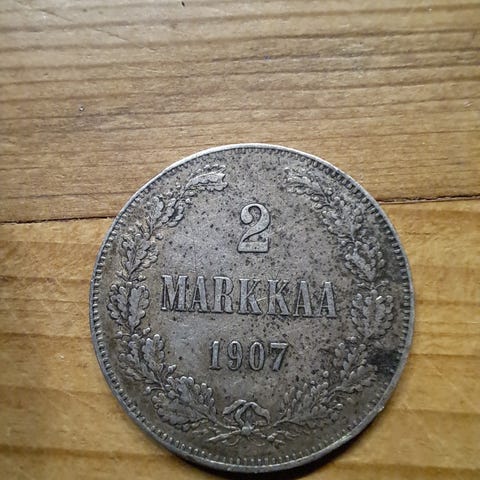 Suomen vuoden 1907 hopeakolikko. Tämä on kaksipuolinen: toisella puolella arvomerkintä ja vuosiluku, toisella puolella teksti ja vaakuna. Kolikko on läpinäkyvässä suojakotelossa. Soveltuu esimerkiksi kokoelmakäyttöön tai numismatiikan harrastajalle.