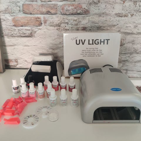 Myydään pakettina välineet geelilakkauksiin.