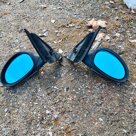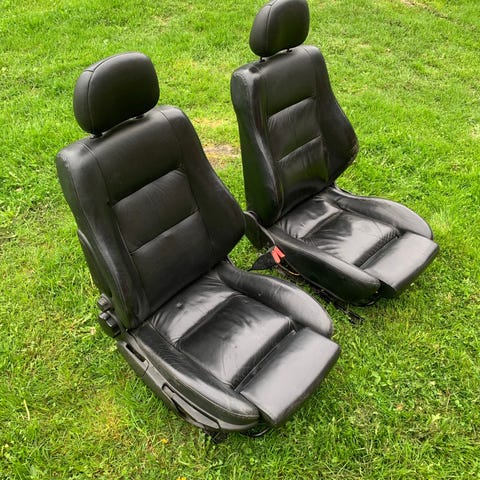 Auton etuistuimet, verhoiluna musta nahka Sähkösäätömekanismit ja kiinnityskiskot näkyvissä. Sopivat varaosiksi tai korvaaviksi istuimiksi ajoneuvoon, jossa mitat ja kiinnityspisteet vastaavat näitä istuimia. Istuimissa näkyy käytön jälkiä ja kulumaa pinnassa. Perselämmintin on