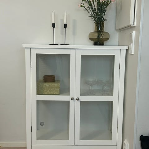 Mäntyinen vitriinikaappi. Jonkin verran käytön jälkiä, mutta siisti ja hajuton. Noudettava itse.
