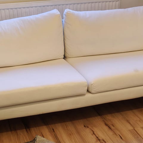 No tears, no stains, and gently used. Very comfortable and spacious – perfect for a bigger living room. Looks like new cleaned and washed