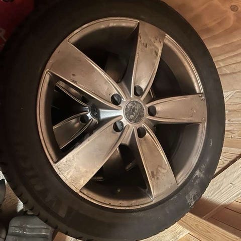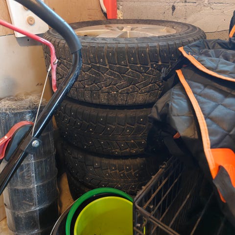 Grand voyagerissa olleet kesärenkaat omilla vanteilla, pintaa vielä reippaasti jäljellä.