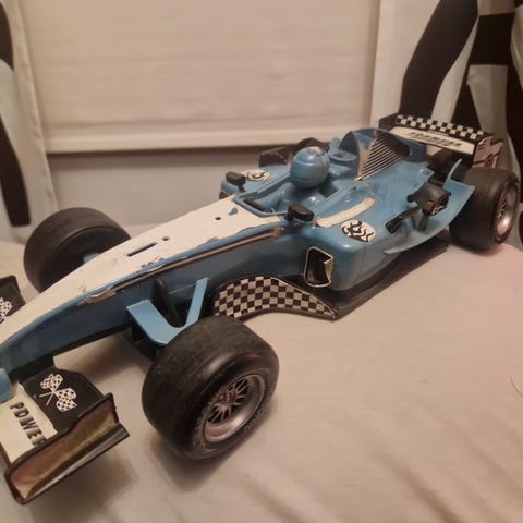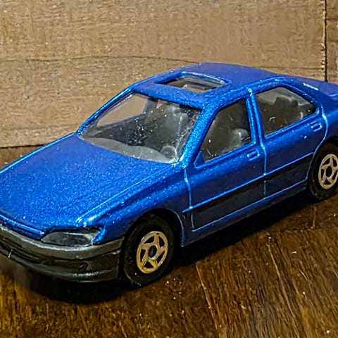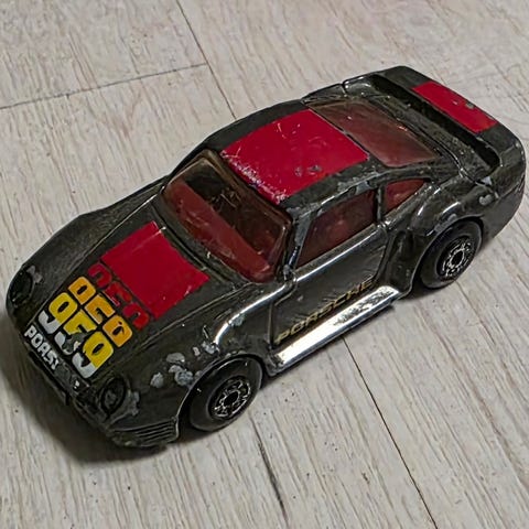 Musta leikkiauto, joka esittää matalaa urheiluautoa. Autossa on violetit salamakuvioinnit konepellissä, katolla ja sivuilla sekä vaaleat vanteet. Sopii esimerkiksi kokoelmaan tai leikkeihin pienoismalliautona.