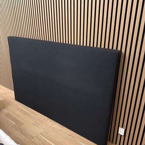 Maskusta ostettu harmaa sängynpääty parisänkyyn. Kangas hieman taittunut keskeltä. Kevyt (ilmeisesti styroksia).