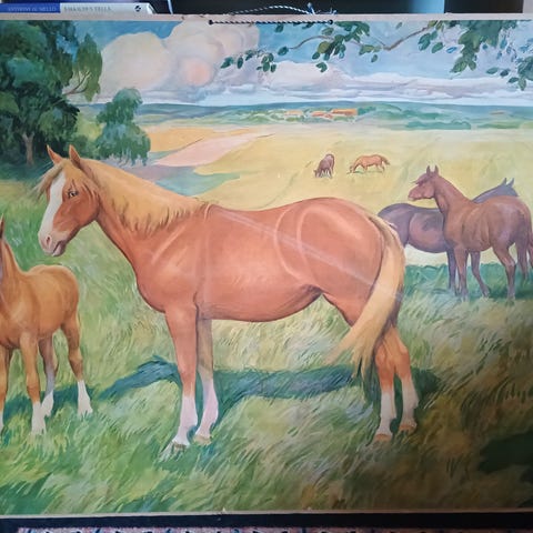 Opetustaulu "Hevonen". Hyväkuntoinen ikäisekseen. (Vaalea läikkä kuvassa on tullut salamavalosta eli ei ole itse taulussa.) Koko 40x45cm. Hyväkuntoinen ikäisekseen. (Vaalea läikkä kuvassa on tullut salamavalosta eli ei ole itse taulussa.) Koko 40x45cm