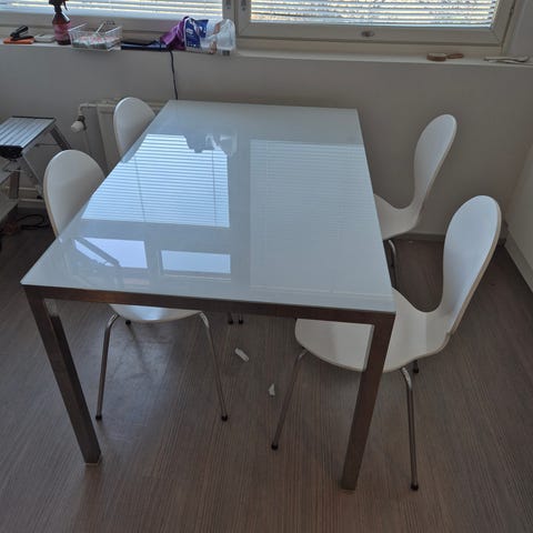 Moderni ruokapöytä kolmella yhteensopivalla tuolilla. Tukeva ja hyvässä kunnossa. Pöytälevyssä yksi näkyvä pyöreä jälki (vain kosmeettinen, katso kuva). Sopii hyvin pieneen ruokailutilaan tai asuntoon. Nouto.