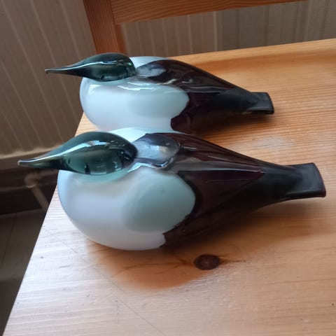 Pienet lasiset lintukoristeet. Kaksi erillistä lintuhahmoa, joissa pyöreä muoto ja lyhyt pyrstö. Värit ovat tummasävyiset ja monivivahteiset. Sopivat esimerkiksi sisustuselementeiksi hyllylle, vitriiniin tai pöydälle aseteltavaksi. Koristeet on valmistettu lasista ja ne myydään parina.