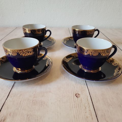 Kupit ovat syvän tummansiniset (kobolttilasite) ja koristeltu kultakoristelulla.
