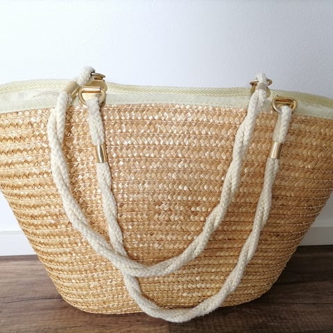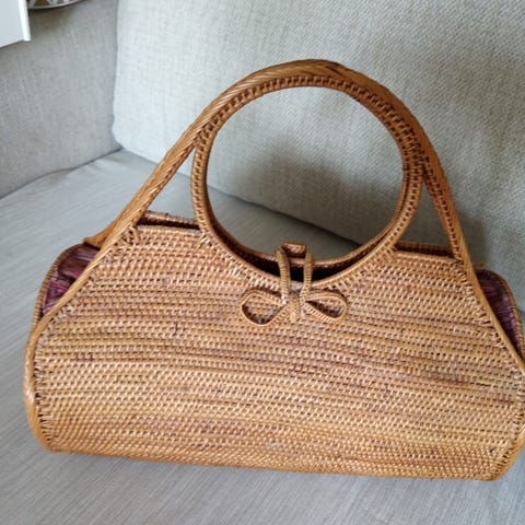 Balilaista käsityötä. Muuten hyvässä ja käyttämättömässä kunnossa, mutta muutama rottinki on edestä katkennut. Ei näy kuin läheltä katsoessa.