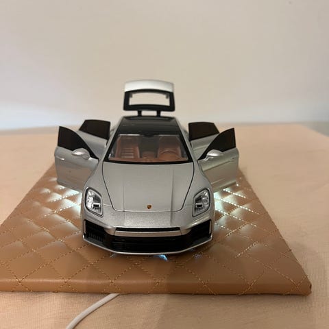 Lelupienoismalli urheiluauto. Autossa on painetut numerot ja tekstit kyljissä sekä konepellissä. Sopii leikkeihin tai kokoelmaan pienoismalliautoista kiinnostuneelle. Materiaali vaikuttaa olevan metallia ja muovia. Pituus on arviolta muutamia senttimetrejä, eli tyypillisen pikkuauton kokoluokkaa.