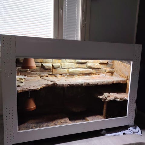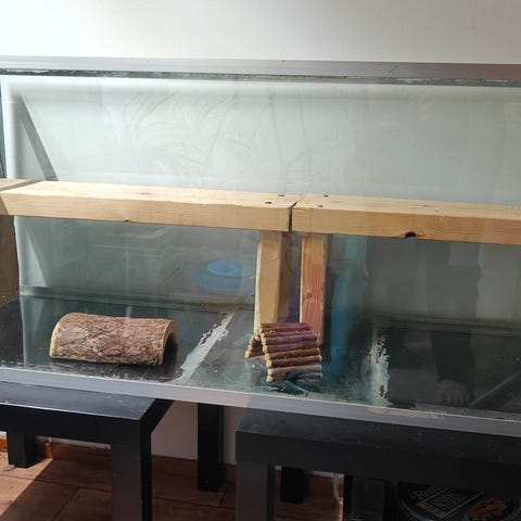 VARATTU LA 21.2. ASTI. 450 Litrainen akvaario/terraario kaapilla. Terraariossa kaareva etulasi ja puukuvioinen runko. Alla säilytystilaa kaapissa, jossa ovet ja hyllyjä. Sopii esimerkiksi pienille jyrsijöille tai muille pieneläimille. Kuvissa näkyy yksityiskohtia sisäsaumoista, saranasta ja pohjan kiinnityksestä.