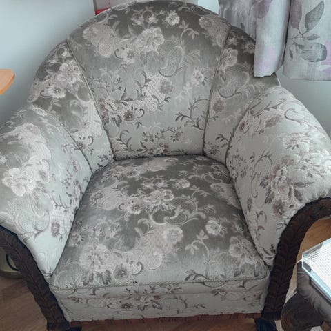 Koivupuurunko, istuin punottu mustasta satulavyöstä. Yksi kulunut satulavyö uusittu (tummempi), muut ilmeisesti alkuperäiset. Ostettu käytettynä 2023. Kunto tyydyttävä.