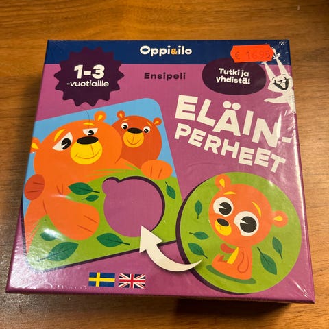 Vielä muoveissa oleva pahvinen peli vauvalle tai taaperolle, jossa eläinhahmoja. Isot osat.