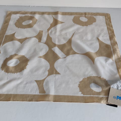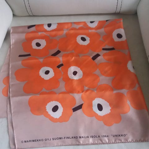 Uusi/ käyttämätön Marimekko, Unikko- huivi, väri vaaleansininen. Koko noin 50x54 cm. Huivissa pieni tahra, joka ollut jo ostovaiheessa (ei juurikaan näy, veikkaan että lähtisi pesussa pois) Kuva tahrasta