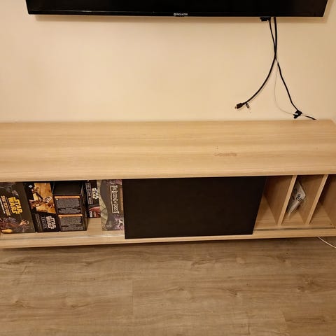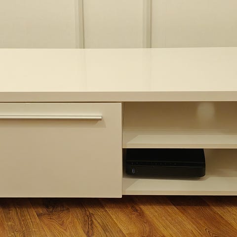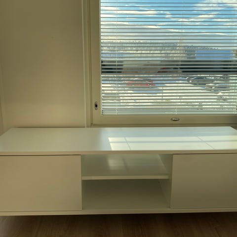 Valkoinen tv-taso kahdella liukuovella. Vasemmalla takalevyssä reikä. Vain nouto