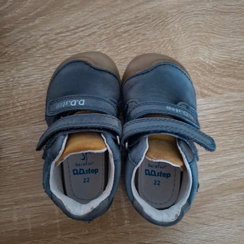 D.D.Stepin vaaleansiniset paljasjalkakengät välikauteen. Koko 22, pohjallisen pituus n. 13,8 cm. Nahan vaaleansinisessä värissä on kulumaa ja iltissä tummentumaa, mutta muuten kengät ovat vielä hyväkuntoiset. Kenkien pohjat ja kantapään kissakuvio hohtavat pimeässä!