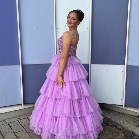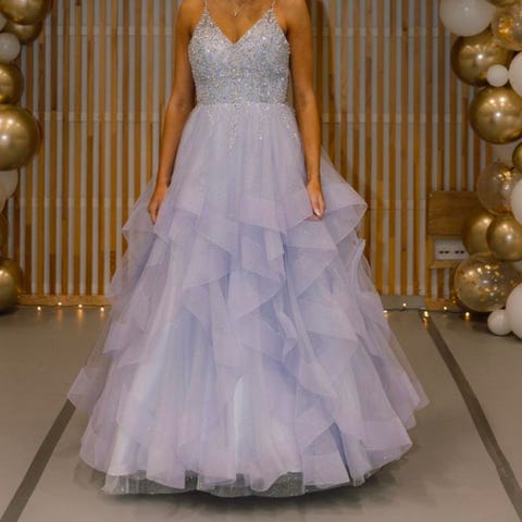 Olen itse noin 162cm ja tanssin ballerinoilla. Mekkoa lyennetty ompelijalla ompelemalla, joten helman pituuden voi palauttaa alkuperäiseen. Mekon koko xs, mutta takana nyöritys joten voisi sopia myös s-kokoiselle.