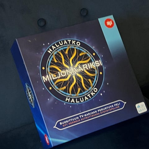 Kyseessä vanha versio haluatko miljonääriksi pelistä,jossa suurin osa kysymyskorteista sekä rahoosta on tallessa,kuten kuvasta saattaa huomata.