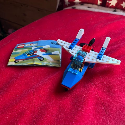 Otsikon mukainen LEGOn kanssa yhteensopivista rakennuspalikoista koostuva lentokone. Ei alkuperäistä pakkausta, ohjeet PDF-tiedoston muodossa. Koko 83x42x15cm.