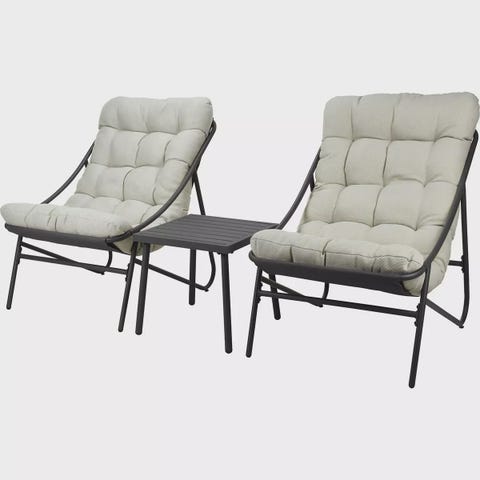 Tämä 3-osainen puutarhakalustesetti on suunniteltu parvekkeelle, pienelle terassille tai suojaisaan pihankulmaan, jossa tila on rajallinen mutta mukavuudesta ei haluta tinkiä. Tukeva teräsrunko ja pehmustetut istuimet tekevät setistä toimivan valinnan rentoon oleskeluun ulkona.